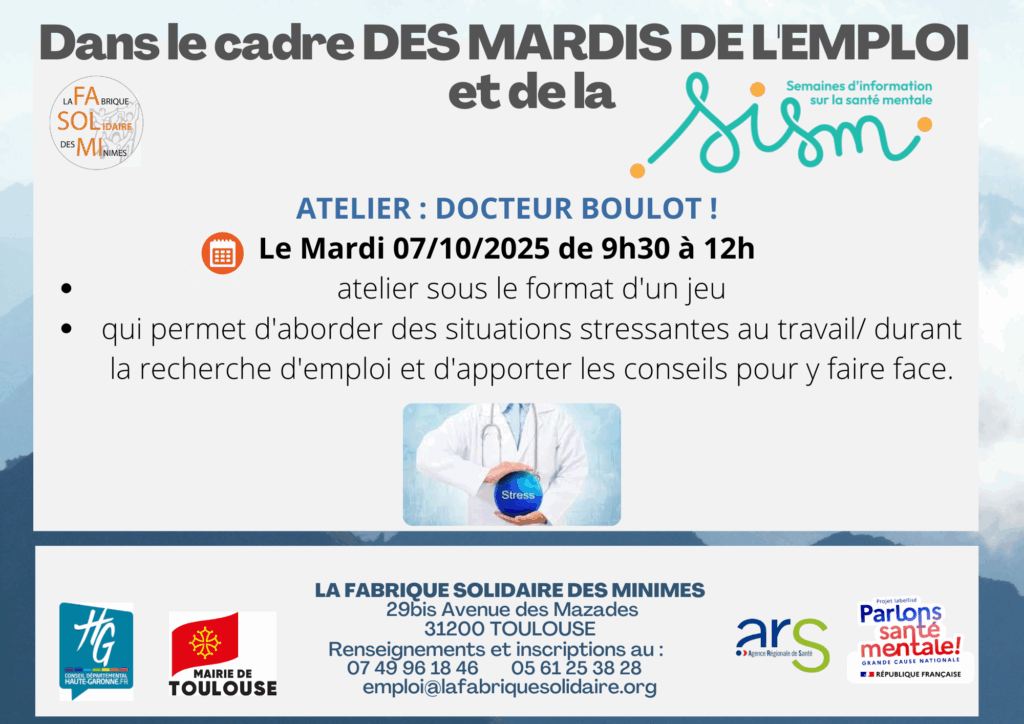 Le 07 octobre, dans le cadre des Mardis de l’emploi et de la SISM, nous vous proposons l’atelier « Docteur Boulot » ! Nous vous attendons nombreux !