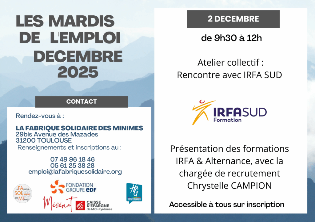 Les Mardis de l’emploi du 2 décembre vous propose de rencontrer IRFA SUD qui vous présentera leurs formations ! Ne tardez pas inscrivez-vous vite !