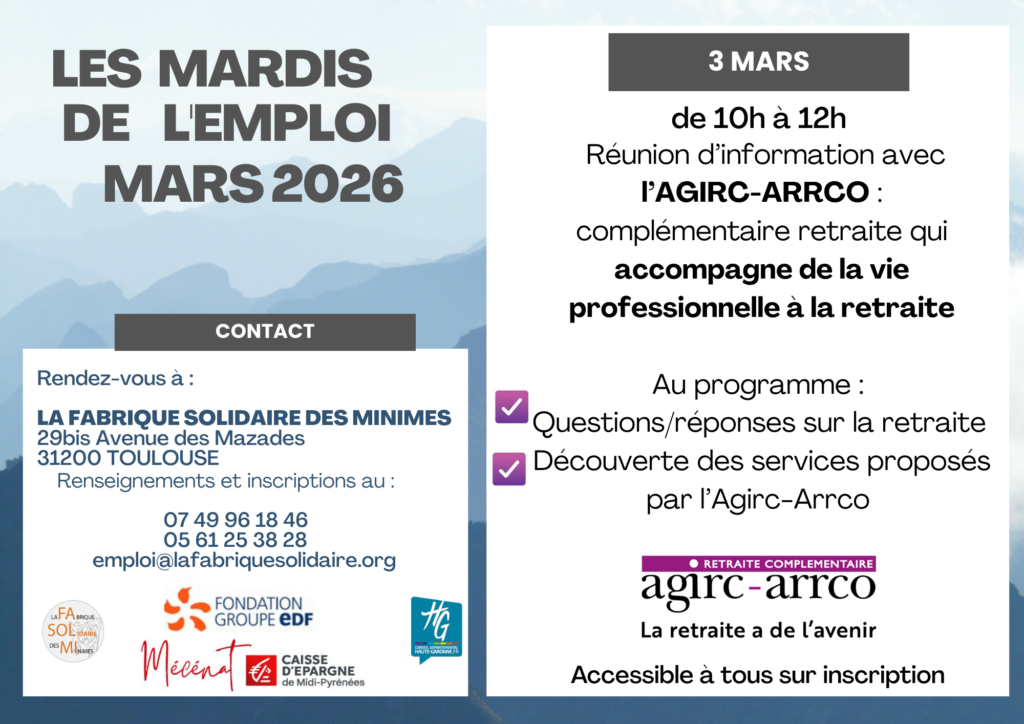 Accueil / Actualités / Ateliers / Les Mardis de l’emploi du 3 mars vous invite à une réunion d’information sur la retraite complémentaire. Inscrivez-vous vite !